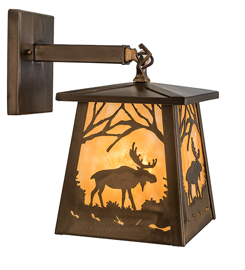 Bring natural beauty into your home with this majestic Moose meandering through the woodlands as the morning sun rises in the background. This wildlife-adorned sconce is artistically designed with a stunning Beige Art Glass lens and lantern hardware featuring an Antique Copper finish. This handsome fixture will warm your home and your heart. Perfect for illuminating hallways, dining areas, and spaces in residential, hospitality, and commercial settings. Complement this fixture with the Moose at Dawn Left Wall Sconce, model 82636, to create a complete design statement. The Moose at Dawn Wall Sconces are included in our American-made, American-designed, handcrafted Wildlife Lighting Collection and are manufactured in Yorkville, New York. The fixtures are UL and cUL listed for dry and damp locations. Upstate New York's adventurous playground, known as the Adirondack Mountains, with its many breathtaking forests, lakes, and rivers, is the spiritual birthplace of Meyda and inspires our rustic-themed art glass collections.