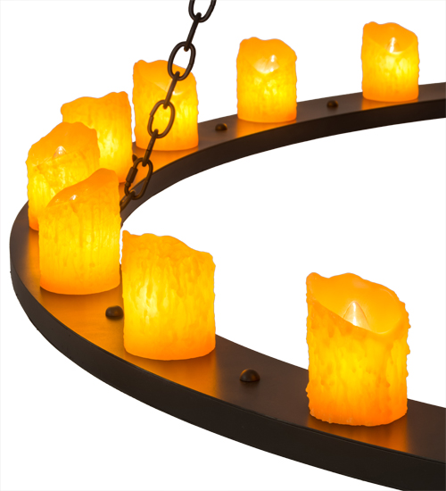 As if it was forged of iron during the Middle Ages and hung from the ceiling of a mighty stone castle, the Loxley two tier chandelier has two rings suspended by chain and tipped with Amber simulated dripped wax candle columns. This rustic fixture is finished in a Timeless Bronze powder coat. Handcrafted by highly skilled artisans in our 180,000 square foot manufacturing facility in Yorkville, New York. Custom designs, colors, and sizes available. UL and cUL listed for damp and dry locations.