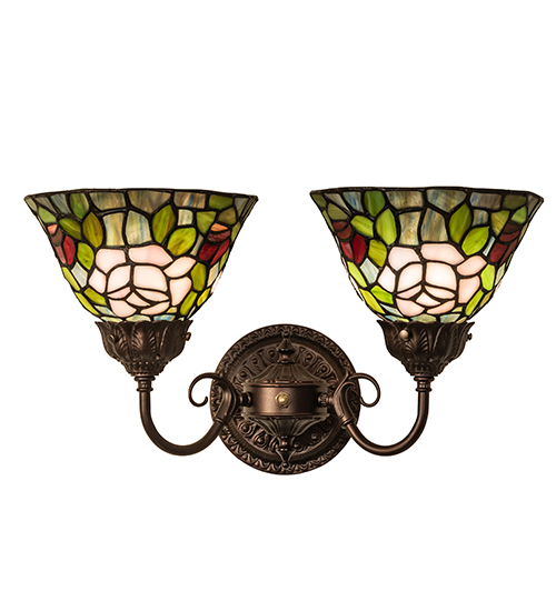The most beloved of all floral beauties. The Rosebush 2-Light Wall Sconce is beautifully represented in this stunning reproduction of a Tiffany Studio Classic. Petal Pink and Romantic Red art glass Roses ramble on a maze of Garden Green leaves. The two stunning shades are created using the famous Meyda Tiffany copperfoil construction. The delicate domed stained glass shades are enhanced with a round backplate and scrolled arms in a warm Mahogany Bronze finish. UL and cUL listed for dry and damp locations.