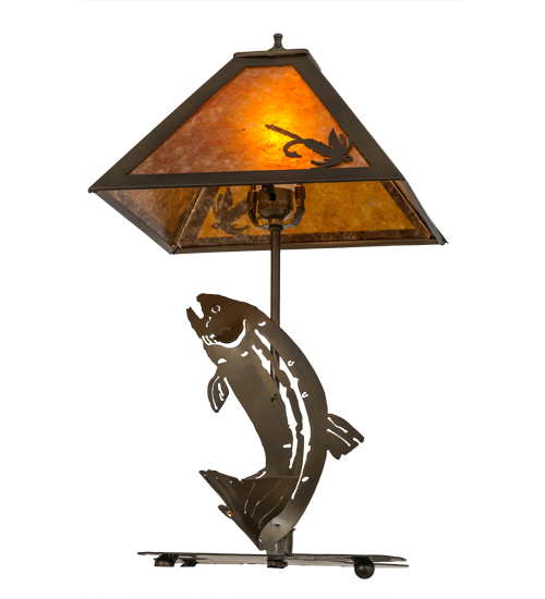 This striking Trout is depicted leaping out of the water from a mountain lake, on a sculpted Trout base featured in an Antique Copper finish. Beautiful ambient light evokes from an Amber Mica shade, which is complemented with an alluring steel fishing accent. The shade is enhanced with a shade frame, hardware and accents featured in a matching finish. Handmade in the USA, this lamp is handcrafted in the Meyda manufacturing facility at the foothills of the Adirondack Mountain lake country. The lamp is available in custom colors, sizes, finishes and dimmable energy efficient lamping options such as LED. The lamp is UL and cUL listed for dry locations.