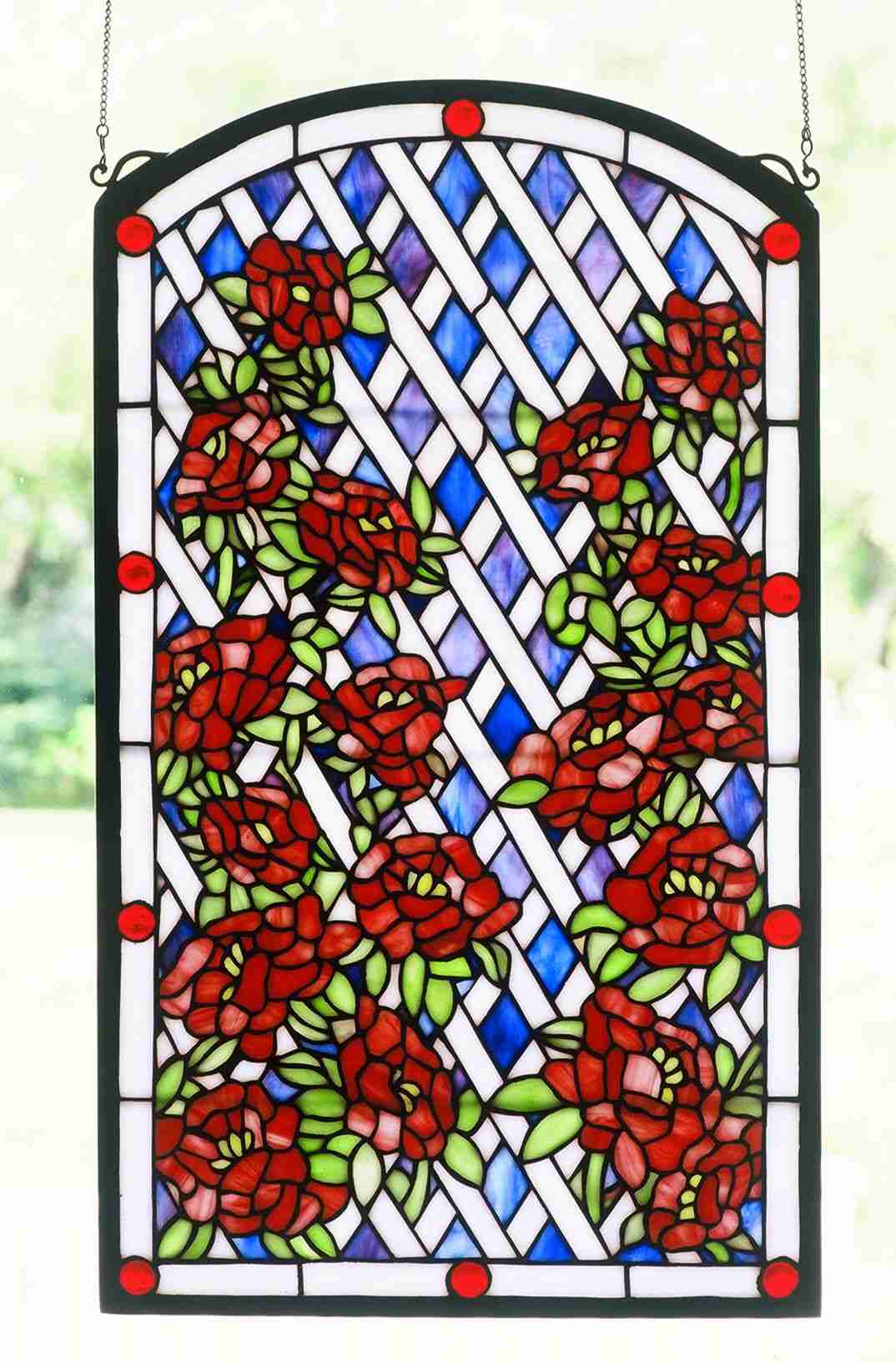 Meyda Tiffany's Roses Trellis Window provides the beauty of blooming roses year round. No need to water. Handcrafted utilizing the copperfoil construction process and stained art glass encased in a solid brass frame, each window is a unique treasure to be owned with pride. Mounting bracket and jack chain included.