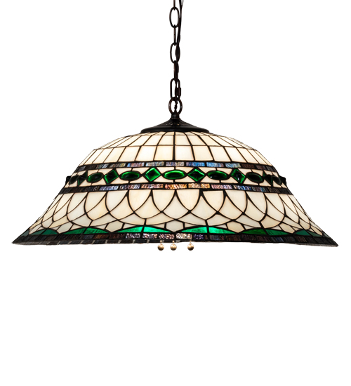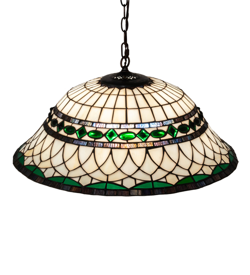 Stunning Emerald-colored jewels and Dark Blue/Plum granite glass bands accent this Bone Beige art glass reproduction of a famous Louis Comfort Tiffany design. The Tiffany Roman pendant features a dome styled shade inspired by Italian art and architecture and handcrafted of authentic art glass using the famous Meyda Tiffany copperfoil construction method. The hardware is finished in a hand applied Mahogany Bronze. The overall height ranges from 14 to 54 inches as the chain length can be easily adjusted in the field to accommodate your specific lighting application needs. UL and cUL listed for dry and damp locations.