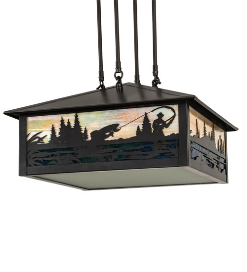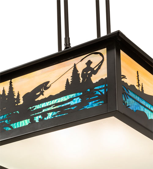 Fishing enthusiasts will cast their lines in delight for this striking lighting design which features a Largemouth Bass leaping out of the lake as the late morning sun rises. Soft ambient light projects through a vibrantly Beige art glass sky above sparkling waters in Blue-Green and Frosted art glass. This Mission styled shade is enhanced with a Statuario Idalight bottom diffuser and a Craftsman Brown finish. Domestically Produced in our 180,000 square foot manufacturing facility in Yorkville, New York. Customize the shade colors, metal finishes and sizes to meet your desires. UL and cUL listed for dry and damp locations.