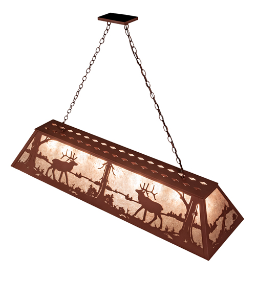 Rustic charm is captured beautifully with this majestic Elk walking by the lake in the forest while the sun rises in the background of this natural wildlife inspired pendant. Soft ambient light projects through stunning Silver Mica panels complemented with a frame and hardware hand finished in Rust.Ideal for placement over kitchen islands, counters, dining and billiard tables.Handcrafted by Meyda artisans in the USA, in our manufacturing facility at the foothills of the Adirondack Mountains. Custom colors, styles and sizes available.Energy efficient lamping options.