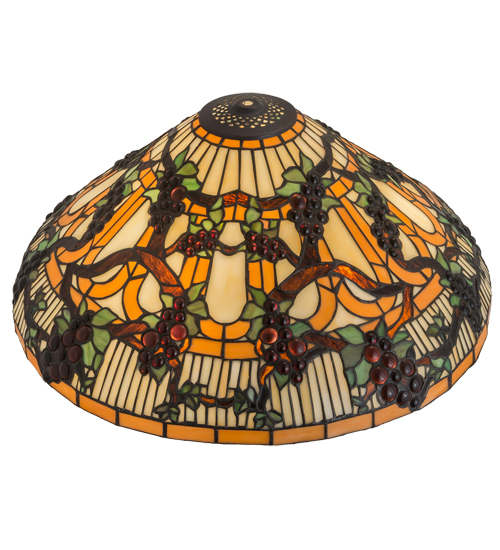 Bring sunny vineyards to your home or business with this lovely Meyda Original pendant. Radiant Concord Purple jewels, Vineyard Green leaves, and glistening dew-kissed Bark Brown vines wrap around the Golden Sunshine banded art glass shade with Red Jewels. The shade is created using the famous Meyda Tiffany copperfoil construction technique. The Jeweled Grape Shade is included in our American-designed, handcrafted Stained Glass Lighting Collection. Each shade is a unique work of art with color variations based on natural ingredients inherent in the glass. Please contact us if color matching is critical when ordering multiple items.