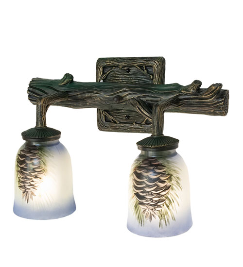 Inspired by nature, hand painted Pinecones and branches of Tan and Bark Brown with Pine Green needles against a Sky Blue ground, grace these distinctive glass shades. Two shades are suspended from a Pine branch detailed two light sconce in a Golden Pine finish.