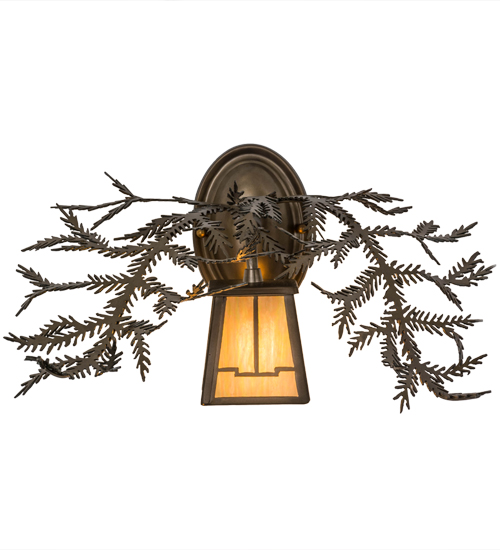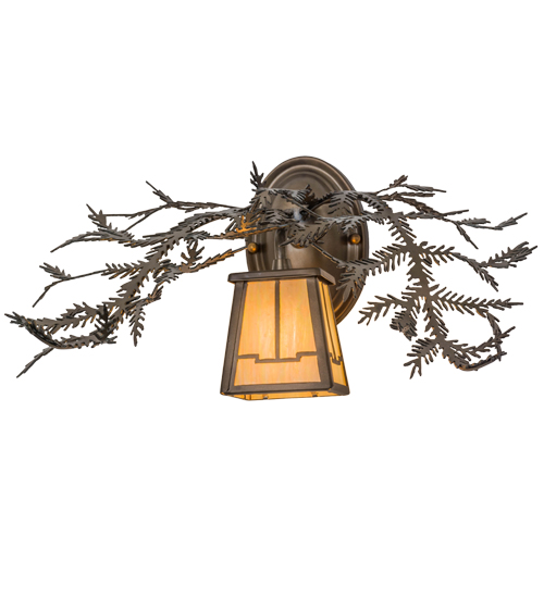 Invite the natural charm of the American woodlands into your home or commercial setting with this nature inspired sconce, which features a Beige Iridescent art glass lantern offered in a stunning Arts & Crafts design. Pine Branch shaped arms accented with pine needles adorn this stunning fixture, which are enhanced with hardware and decorative accents in an Antique Copper finish. Handcrafted in our facility at the foothills of the Adirondack Mountains in the US, this wall fixture is offered in custom sizes, designs and colors available, as well as dimmable, energy-efficient lamping options. UL and cUL listed for damp and dry locations.