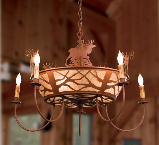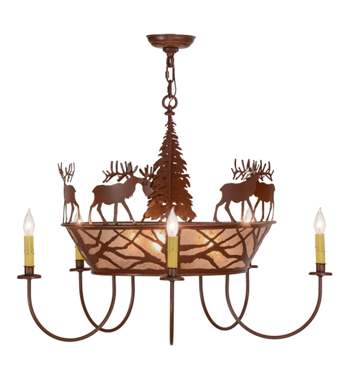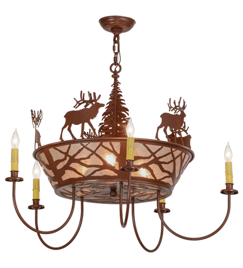 Rustic charm is captured beautifully with majestic Elk walking around a Pine tree which accents a stunning Silver Mica shade, complemented with a frame and hardware featured in a Rust finish. The shade is adorned with five graceful arms and faux candlelights atop bobeches. The fixture is handcrafted by Meyda artisans in the USA, in our manufacturing facility at the foothills of the Adirondack Mountains.
