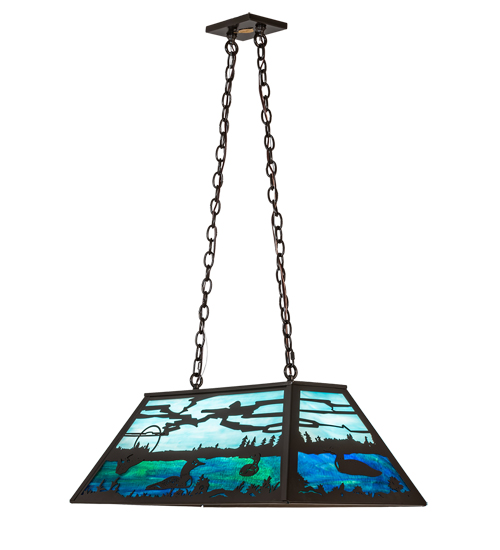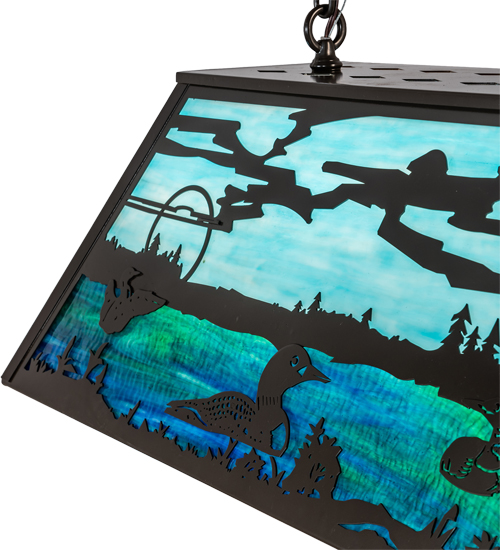 Loons float on on sparkling Bluish Green waters beside Marsh Green grasses in stunning panels handcrafted utilizing stained art glass in a copperfoil construction.Ideal for placement over kitchen islands, counters and billiard tables.Timeless Bronze finished hardware. Custom designs, colors and sizes available.
