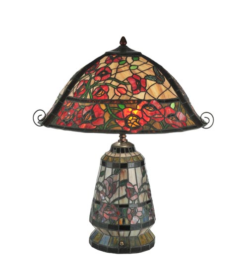 This ravishing Begonia stained glass shade brings a beautiful garden into your home. Brilliant Red Begonia buds and flowers amongst Garden Green leaves adorn this custom stained glass shade on an Amber background. The resplendent table lamp is ideal for highlighting a picture window or adding a lighted accent to a desk or table. The lamp includes a 3-way switch to light the shade, the matching stained glass base, or both. The Begonia Lighted Base Table Lamp is included in our American-designed, handcrafted Stained Glass Lighting Collection. Each shade is a unique work of art, with color variations based on natural ingredients inherent in the glass. This item is Custom Made. Please call for Pricing and Lead Time.