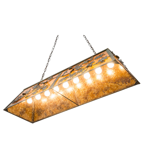 Invite the splendor of Mother Nature in all of its natural beauty.Antique Copper finished Acorns, Branches and Oak Leaves adorn this stunning Amber Mica shade.The frame and hardware are also featured in an Antique Copper finish.This oblong pendant is perfect for illuminating billiard and dining tables, islands, counters and bars.Custom sizes, colors, designs and dimmable energy efficient lamping options, such as LED, are available.The fixture is UL and cUL for damp and drylocations.