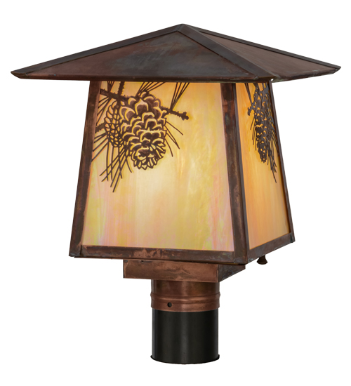 With pinecones and pine needles delicately etched of Solid Brass, this compelling design represents the iconic symbol of spiritual enlightenment and eternal life. Rustic charm comes alive with soft warm ambient light through stunning Beige Iridescent art glass enhanced by Vintage Copper finished hardware on this nature inspired fixture. Ideal for both exterior and interior lighting applications. Handcrafted by Meyda artisans in our manufacturing facility at the foothills of the Adirondack Mountains.