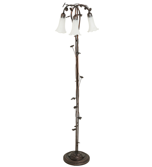 Inspired by the popular Tiffany design from the early 1900s... This floor lamp offers an attractive, delicate design featuring three stunning shades mouth blown of White Favrile style art glass. The Pond Lily shades are embraced by an elegant cast metal floor base with floral and vine accents that are finished by hand in Mahogany Bronze. The Pond Lily Floor Lamp is featured in our American designed, handcrafted Favrile Glass Lighting Collection. UL and cUL listed for dry locations. Each shade is a unique work of art with color variations based on natural ingredients inherent in the glass. Contact us if color matching is critical when ordering multiple items.