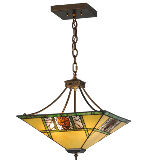 This charming nature inspired pendant features a Pinecone Mission designed shade with Bark Brown granite glass Pinecones on a Clear granite glass background with pine needle detailing. Bone Beige stained glass is geometrically divided by Moss Green bands on the shade, suspended by hardware hand finished in Antique Copper.