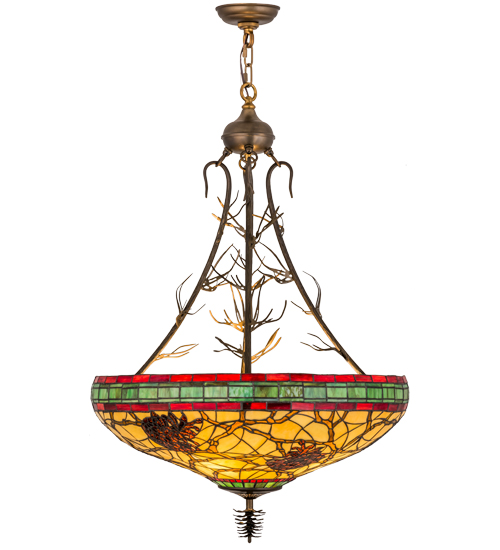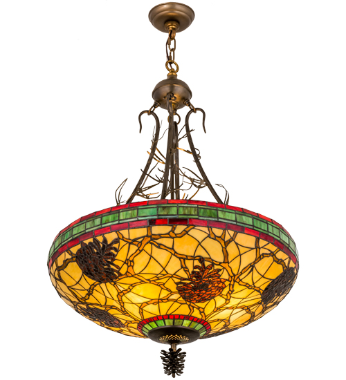 This stunning design features the iconic pinecone, one of Mother Nature's most compelling organic symbols, which offers a natural elegance and represents the evolution of human enlightenment. Burgundy and Leaf Green bands edge this woodland shade that highlights Light Brown pinecones and Golden Sun branches on a Beige art glass shade. The art glass shade, which is created using Meyda Tiffany's famous copperfoil construction process, is enhanced with hardware finished in Antique Copper and accented with matching pine needles. Custom sizes, styles and energy efficient lamping options are available.