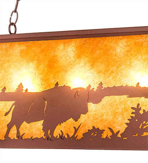 The natural charm of wildlife is captured beautifully with the magnificent Buffalo wandering near a woodland lake while the early summer sun rises in the background. Beautiful ambient lighting is evoked through stunning Amber Mica shade with a matching bottom diffuser which is enhanced by the decorative accents, frame and matching hardware in a Rust finish. Ideal for illuminating counters, kitchen islands, bars, and dining or billiard tables. Overall height ranges from 22 to 44 inches as the chain can be adjusted easily in the field. Made to Order in our 180,000 square foot manufacturing facility in Yorkville, NY. Additional wildlife and custom designs are available, as well as custom sizes, metal finishes and lamping options. UL and cUL listed for dry and damp locations.