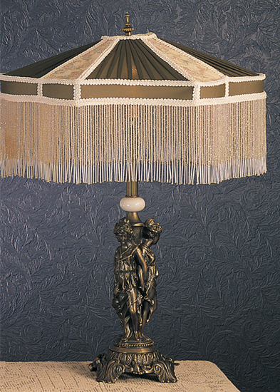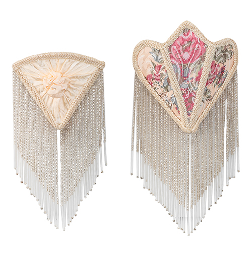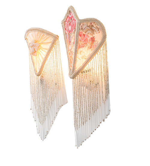 An alluring and beautiful set of night lights. One night light features an Ivory fabric shade with Pink Tulip and Green Leaf damask fabric, and the other features White fabric with a charming White Rose accent. Both are edged in long clear glass beaded trim. The night lights are ideal for illuminating kitchens and baths and were inspired by beautiful fabrics and fashion from New York, to Chicago, Illinois, and Los Angeles, California. The Fabric & Fringe Night Light Set is featured in our American-designed, handcrafted Fabric & Fringe Collection. UL and cUL listed for dry locations.