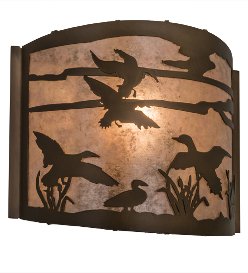 A flock of Ducks in and above cattails and marsh grasses accent this wildlife inspired wall sconce handcrafted in the USA by Meyda artisans. This fixture is finished in Antique Copper and has silver mica panels.