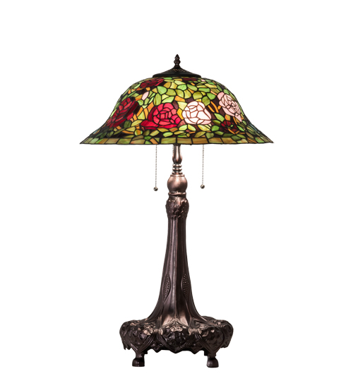 The most beloved of all floral beauties. The Rosebush is beautifully represented in this stunning reproduction of a Tiffany Studio Classic. Petal Pink, Romantic Red and Plum Passion art glass Roses ramble on a maze of Garden Green leaves. The shade is created using the famous Meyda Tiffany copperfoil construction. The delicate domed stained glass shade is paired with a Mahogany Bronze finished lamp base. UL and cUL listed for dry locations.