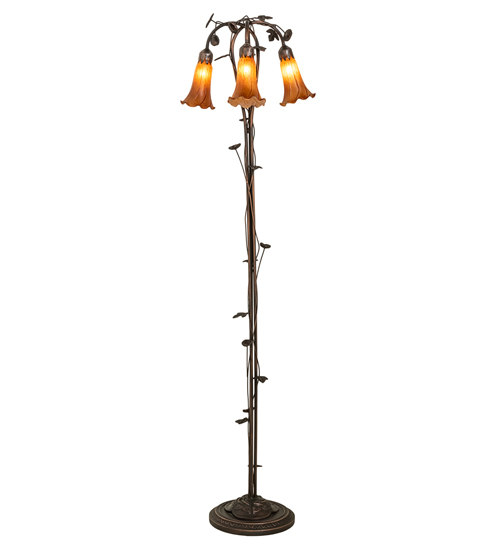 Inspired by the famous Tiffany design from the early 1900s... This floor lamp features three stunning shades mouth blown of fine Amber art glass. The shades are embraced by an elegant floor base wrapped in metal vines and flowers finished by hand in Mahogany Bronze. The Pond Lily Floor Lamp is featured in our American designed, handcrafted Favrile Glass Collection. UL and cUL listed for dry locations. Each shade is a unique work of art with color variations based on natural ingredients inherent in the glass. Contact us if color matching is critical when ordering multiple items.