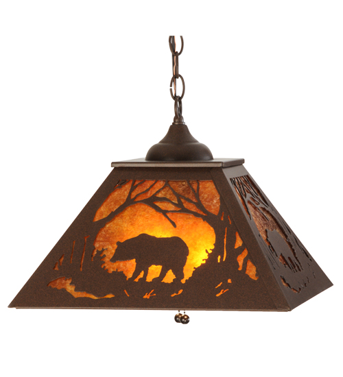 Drawing inspiration from the wildlife and natural beauty in the nearby Adirondack Mountains, this stunning fixture depicts a majestic Bear wandering through the woodlands as the morning sun rises in the background. Warm ambient light is evoked through Amber Mica complemented with a frame and hardware featured in a Cafe Noir finish. Handcrafted by Meyda artisans in our Yorkville, NY facility. Custom designs, styles and sizes available. Energy efficient lamping options.