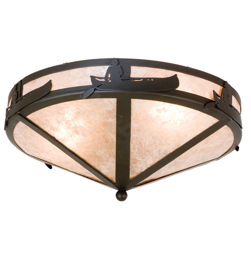 A Canoe on a lake is paddled by the woods on this nature inspired pendant. The rustic fixture is finished in Timeless Bronze, has Amber mica panels and is handcrafted in the USA by Meyda artisans.
