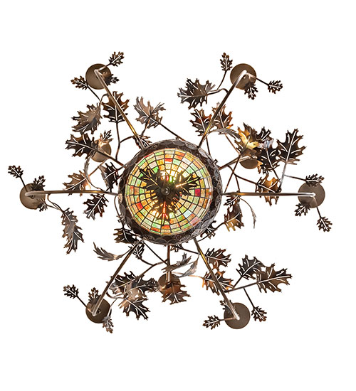 Majestic as the mighty oak is this leaf adorned 9 arm chandelier in an antique copper finish. A lighted stained glass acorn, in multi toned Autumn Green with a Bark Brown granite glass crown that sprouts candle topped, oak leaf covered branches. Each branched arm has with a beautifully simulated dripping wax candlestick in Ivory. The elegant hardware is hand made in the USA by Meyda Tiffany craftsmen.