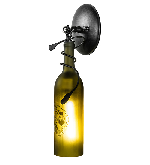 Hand-etched with The Barrel Room Winery Room, this personalized Wine Bottle Wall Sconce does so much more than deliver light; it adds personality and pizzazz. A Green bottle features the hand-etched logo and grape design and is embraced with vine-like accents and hardware featured in a Textured Black finish. This rich-looking Tuscan Vineyard Personalized Wine Bottle Wall Sconce is included in our American-made, American-designed, handcrafted Wine Bottle Lighting Collection. The fixture is manufactured in Yorkville, New York. UL and cUL listed for dry and damp locations. Take your finest bottle of wine, and Meyda will transform it into an everlasting personalized fixture of light. Contact us for more information on personalized and custom wine bottle lighting fixtures and lamps. The fixture can be custom-designed with your name, company logo, or any other message. You can also create custom lighting with beer bottles, mason jars, milk bottles, and other glass containers and vessels by contacting us!