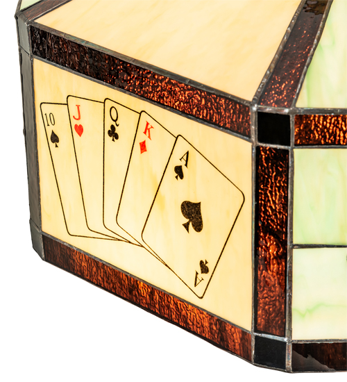 Play your cards right with this winning Poker hand, a Meyda original stained glass lighting design. The high cards are etched and inlay painted on Bidding Beige glass while suit symbols of Black and Red float on a Currency Green sky. The art glass shade is accented with Bankroll Brown granite glass bands. It pairs well with a table lamp such as 252404 and floor lamp 252397, or matches with hardware to create a ceiling pendant 81305 or wall fixture. The Poker Face Shade is featured in our American designed, handcrafted Stained Glass Lighting Collection. Each shade is a unique work of art with color variations based on natural ingredients inherent in the glass. Contact us if color matching is critical when ordering multiple items.