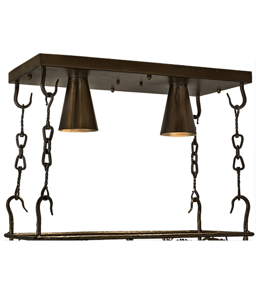 Nature inspired Pine Cones and needles adorn this handsome lighted oblong lighted pot rack. The fixture is finished in Antique Copper and is handcrafted in the USA by Meyda artisans. (Cookware not included)