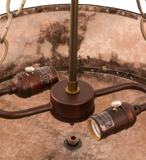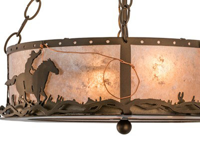 A cowboy riding his trusty horse with a lasso in-hand is depicted chasing steer across the prairie as the late afternoon sun lowers in this western inspired ceiling fixture design. Warm ambient light projects through stunning Silver Mica, which is complemented by accents and hardware featured in an Antique Copper finish. Handmade in the USA, this fixture is handcrafted by Meyda artisans in our Yorkville, New York manufacturing facility. Custom colors, sizes and styles are available, as well as dimmable energy efficient lamping options.