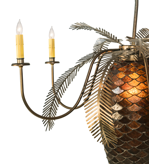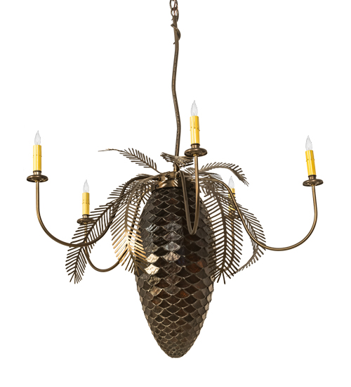 A large lighted Pinecone constructed of hand cut Bark Brown granite glass is adorned with Pine bough covered arms that terminate in elegant simulated wax candles. This handsome five arm chandelier has an Antique Copper and a rustic lodge appeal. All metal work is hand crafted in the USA by Meyda artisans.