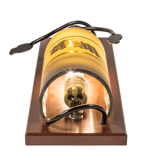 A hand forged Black Cherry finished vine and leaf coil is designed around the neck of this stunning Frosted Green wine bottle with an Etched Grapes design. Your connoisseur will appreciate the detail and vintage of this charming pocket wall sconce. The backplate is hand finished in Copper Metallic Handcrafted in the USA by our artisans, the fixture is offered in custom styles, colors and sizes. Energy efficient lamping options are offered. The fixture is UL and cUL listed for damp and dry locations.