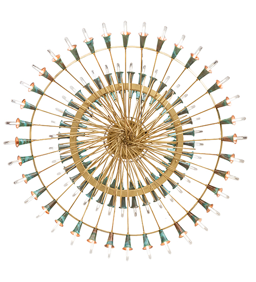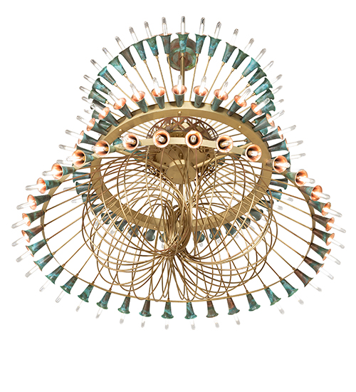 A magnificent masterpiece of Brass, Copper, and energy-efficient LEDs that speaks to drama, excitement, and celebration of beautiful lighting and design. Spring into action and select this innovative chandelier, which features organically bent Brass Tubing finished in Brushed Brass. Beautiful Verdigris Copper finished socket cups, designed like Trumpet Lily flowers, pair with 108 customer-supplied lamps throughout the fixture. This massive three-tiered chandelier is ideal for illuminating entryways, lobbies, and ballrooms in hotels and other commercial lighting installations. The canopy and decorative banding accents are crafted of Copper. This chandelier matches well with two complementary lighting fixtures: the 42 Wide Coyle 36 Light Semi-Flushmount, model 274854, and the 60 Wide Coyle 72 Light Chandelier, model 274991. The Coyle Chandelier is featured in our American-made, American-designed Coyle Chandelier Collection, which is manufactured in Yorkville, New York. UL and cUL listed for dry and damp locations. The fixture was created for The Memorymakers at Landmark Hospitality, which owns The Albion Summit in Summit, New Jersey.
