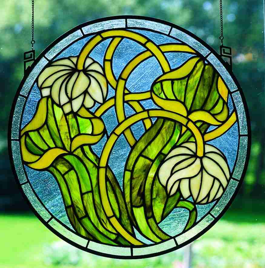 17"W X 17"H Pitcher Plant Medallion Stained Glass Window